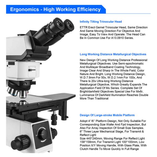 New Design Of Long Working Distance Professional Metallurgical Objectives. Use Semi-apochromatic And Multilayer Broadband Coating Technology, Image Clear And Sharp In The Whole Field, Color Nature And Bright. Long Working Distance Design, W.D.7.9mm For 50x, W.D.2.1mm For 100x, And There Is 20x Ultra-long Working Distance Metallurgical Objective, Which Greatly Expands The Application Field Of Mx Series. Complete Set Of Bright/darkfield Objectives Special Use For Mx6r, Luminance Of Darkfield Illumination Reaches Double More Than Traditional
